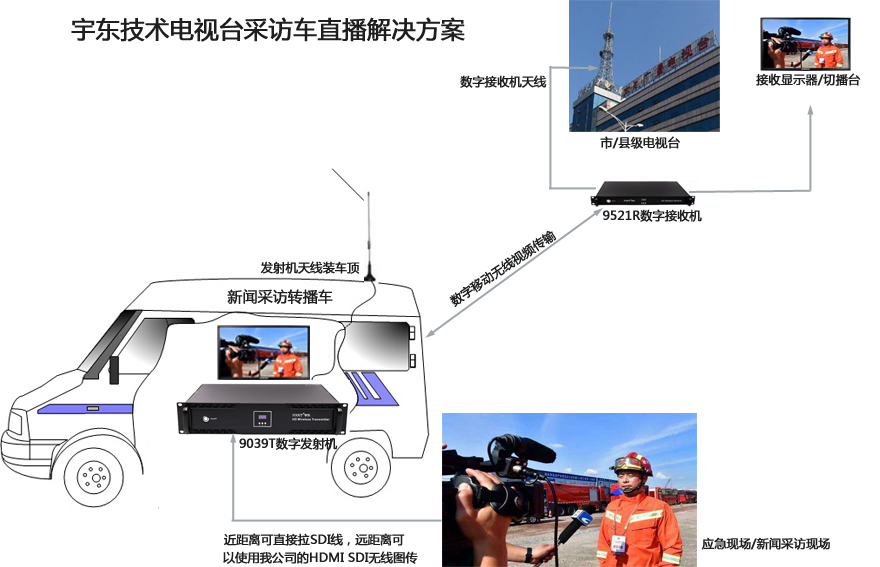 電視臺(tái)現(xiàn)場(chǎng)采訪車無(wú)線視頻信號(hào)遠(yuǎn)距離傳輸,直接在車上安裝車載無(wú)線圖傳系統(tǒng),配合車載播出系統(tǒng)切換系統(tǒng),能實(shí)時(shí)將多路攝像頭信號(hào),任意切換后通過(guò)無(wú)線發(fā)射,直接在電視臺(tái)播出機(jī)房接收到現(xiàn)場(chǎng)信號(hào),再通過(guò)光纖鏈路,傳輸?shù)诫娨暟l(fā)射塔,通過(guò)開路電視發(fā)射出去,也可以通過(guò)有線電視線路傳輸。指揮中心或者老百姓就可以通過(guò)足不出戶,看到活動(dòng)場(chǎng)面的實(shí)時(shí)畫面。