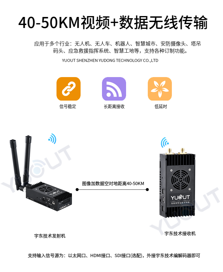 YD-TS0050-WK  是應用于無人機行業的圖數控一體化超遠距離無線傳輸設備(最遠可達 40至50 公里),具有體積小、功耗低、通信距離遠等特點,支持高清視頻、飛控數據、云臺控制數據、遙控器控制數據等同時傳輸。