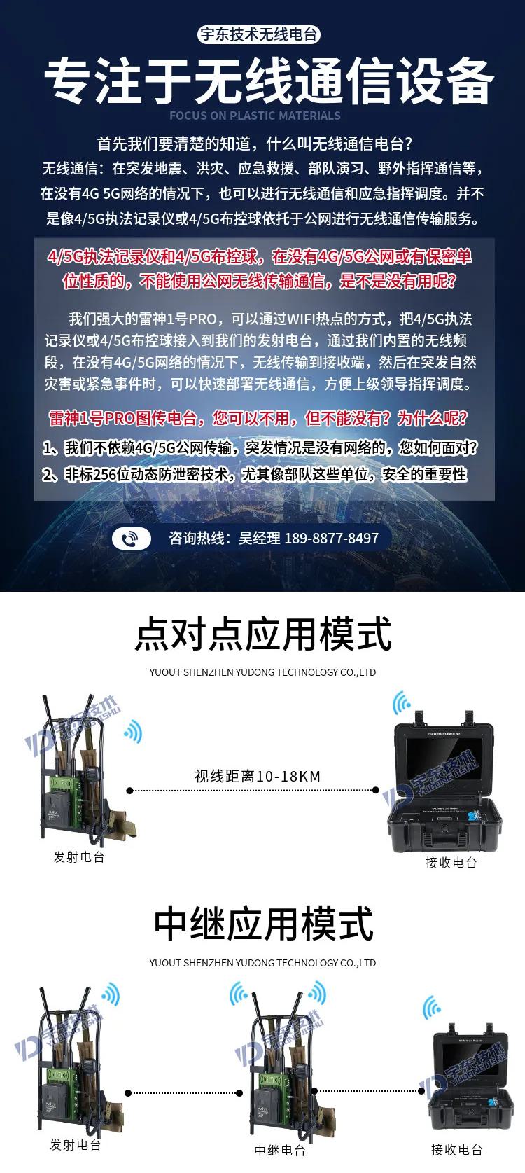 宇東技術雷神1號PRO背負式高清單兵無線圖傳電臺,是公司針對應急救援指揮、部隊拉練演習、公安、反恐作戰、消防救援、邊防執勤、海警海關巡檢、森林消防等,在突發重大事件,斷網斷電,通信中斷的情況下,現場工作人員通過宇東雷神1號PRO單兵無線圖傳電臺,可以和指揮部雙向語音通話對講,把現場采集的數據實時無線傳輸到指揮車/臨時指揮部大屏幕,讓指揮部領導對現場情況一目了然,節省了到達現場的時間,可快速做緊急指揮調度,最大限度的減少突發事件帶來的各種損失。
